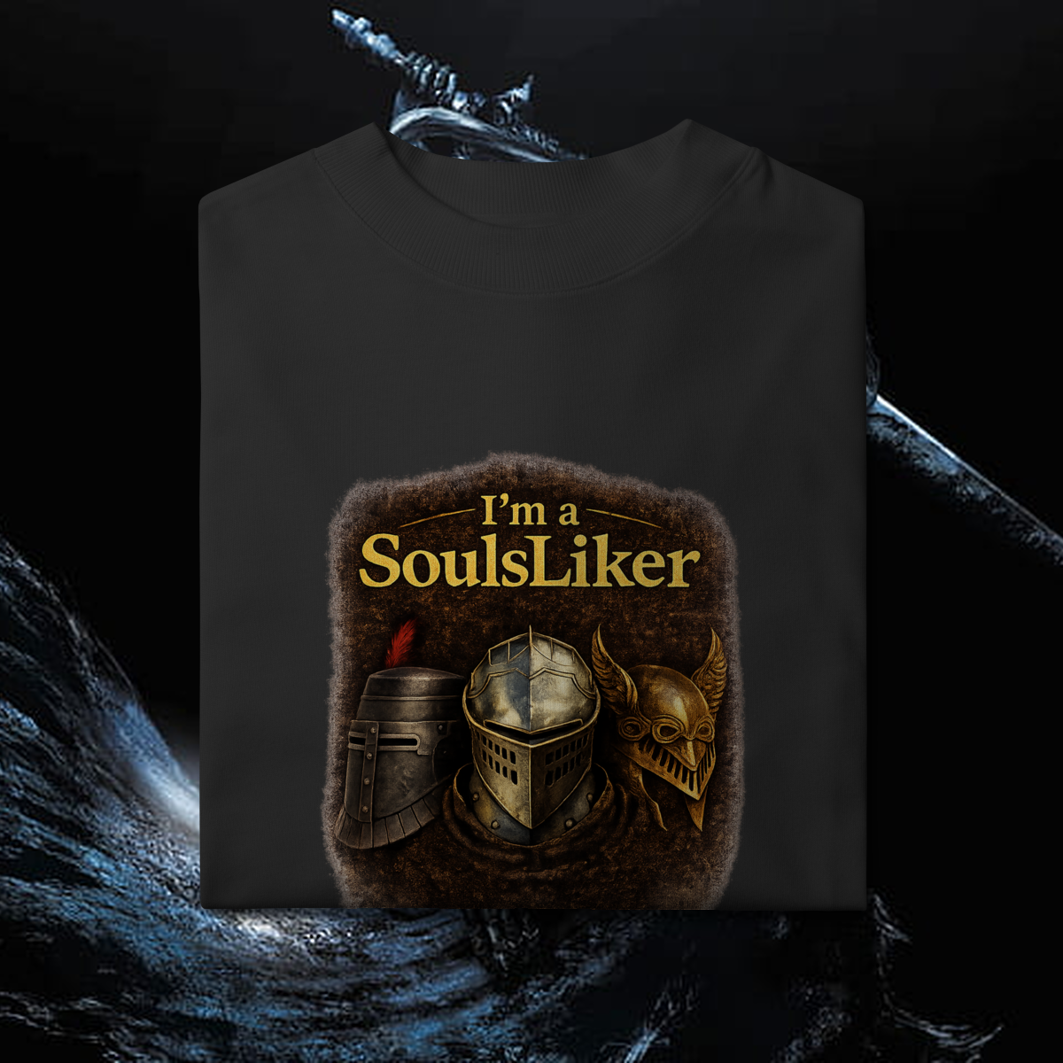 A tipografia dourada com acabamento rústico reforça o tom lendário da arte, celebrando jogadores que apreciam desafios intensos, narrativas profundas e combates estratégicos. Ideal para fãs de RPG, fantasia medieval e jogos de dificuldade elevada, esta estampa transmite identidade, resistência e paixão por experiências imersivas.